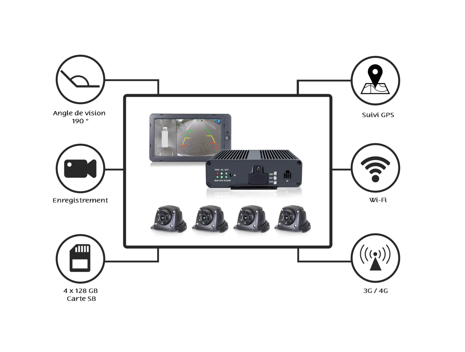 Le système de caméra panoramique NBS 360° offre une véritable vision panoramique de la conduite avec image HD 1080P. En raison de leur taille et de leur longueur, certains équipements possèdent plus d’un angle mort. Le système 360° permet de couvrir l’ensemble de ces angles morts à l’aide d’un seul système pour une conduite plus sécuritaire. Il est spécialement conçu pour les camions, les autobus, les véhicules lourds et bien plus.