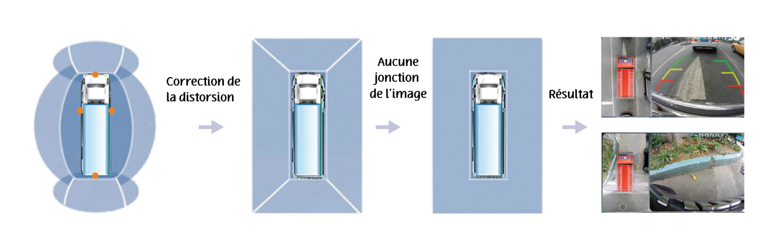 Le système de vision panoramique NBS offre simultanément une vue arrière, avant et latérale claire de votre conduite. Il permet une synthèse d'images panoramiques; il rectifie la distorsion de l'image pour assembler de manière transparente et restituer une scène 3D en temps réel. La vision 360° affiche le scénario de conduite réel et permet d’obtenir une vue réelle à vol d'oiseau autour de votre véhicule.