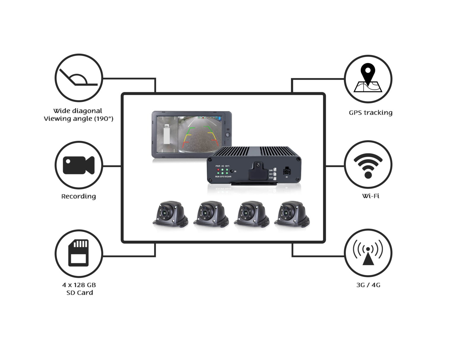 The NBS 360 ° panoramic camera system provides a true surround vision of driving with 1080P HD image. Due to their size and length, some equipment has more than one blind spot. The 360 ° system covers all these blind spots using a single system for safer driving. It is specially designed for trucks, buses, heavy vehicles and much more.
